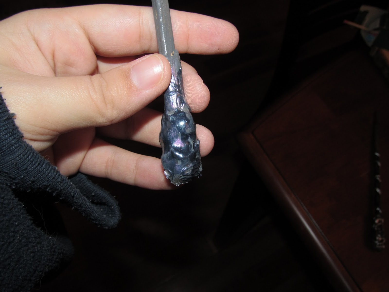 I painted the cones the desired color, and let them dry. I then took the hot glue again, and made designs on them. After the glue had set, I used nail polish to paint the glue streaks. After the nail polish had dried, I applied Mod Podge to the whole length. On the blue "wand," I wrapped cray paper around and then Mod Podged the hell out of it until it was completely saturated. That one took the longest to dry.